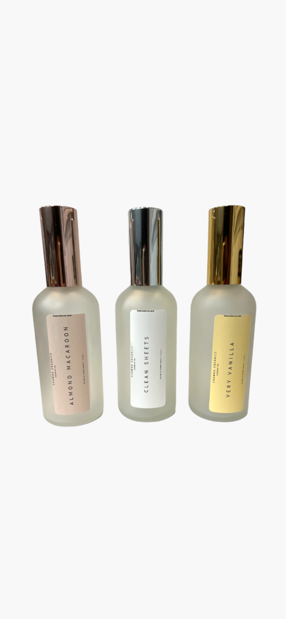 Experience a variety of scents with our room spray set. Choose between sweet almond and vanilla spice or a clean and fruity fragrance. Perfect for any room, our sprays are safe for linen and long lasting without being overpowering. Gift one and keep one for yourself. Transform your space today!